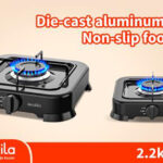 Cocineta de gas de 1 hornilla a glp con salida de calor de 2.2 kw. Encendido manual, base de aluminio fundido y almohadillas antideslizantes.